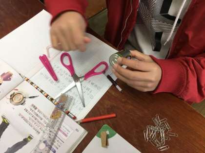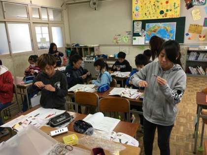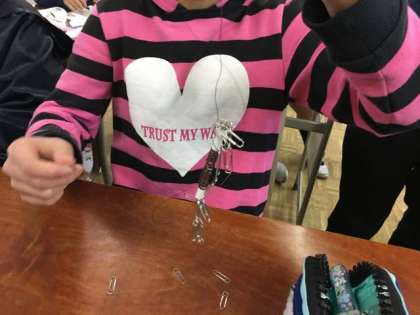 途中でからまらないように、気をつけて巻いていきます。電池をつないでクリップに近づけると・・・ついた!