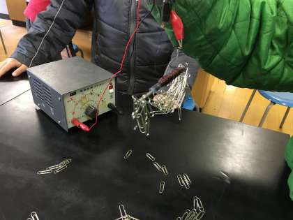 電源装置に電磁石をつなぎ、流す電流を変えて、何個クリップがくっつかを数えました。