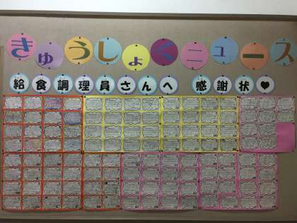 昨日の委員会発表で、いつもおいしい給食を作ってくださっている調理員さんにプレゼントした感謝状を給食の黒板に掲示しました。みなさんも見てください。