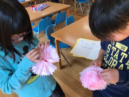 今日はお花紙を使い、飾り付けを作ったり、看板を作ったりしました。