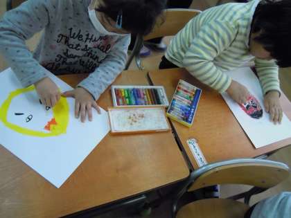 今日は節分です。子どもたちに季節感を味わってほしいので、オニの顔をかきました。