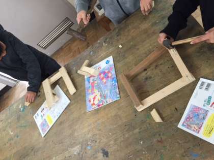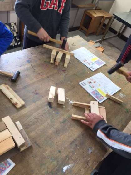 木材をのこぎりでギコギコ。できた木片に釘をトントン。いろいろな形や雑貨に仕上げていきました。ロボットの形にしたり、飛行機の形にしたり、中には立派な本棚をつくったりする子もあらわれました。ミニ大工さんたちが頑張った作品、また見てあげてください。