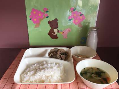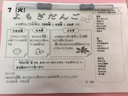 給食のよもぎだんごの原材料は、うるち米ともち米とよもぎです。今回の給食では、蒸したよもぎだんごに、とろみをつけたみつをからめ、喫食時にきな粉をかけて食べました。