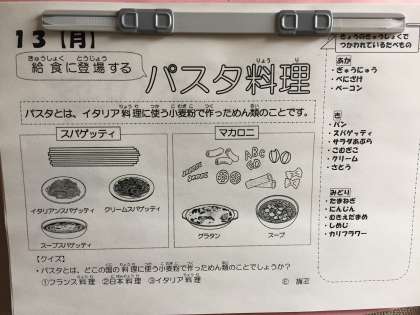 給食では、スパゲッティを使った、スパゲッティミートソース、イタリアンスパゲッティ、クリームスパゲッティやスープスパゲッティ、マカロニを使ったグラタンやスープなどが登場します。