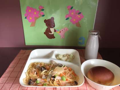 今日の給食には、さけのクリームスパゲッテイがでました。