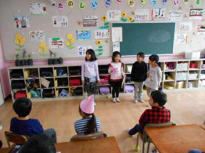 2年生の国語の学習で「名前を見てちょうだい」というお話があるのですが、そのお話を劇にして、1年生に披露してくれました♪教室中をいっぱい使い、とても楽しい劇でした。