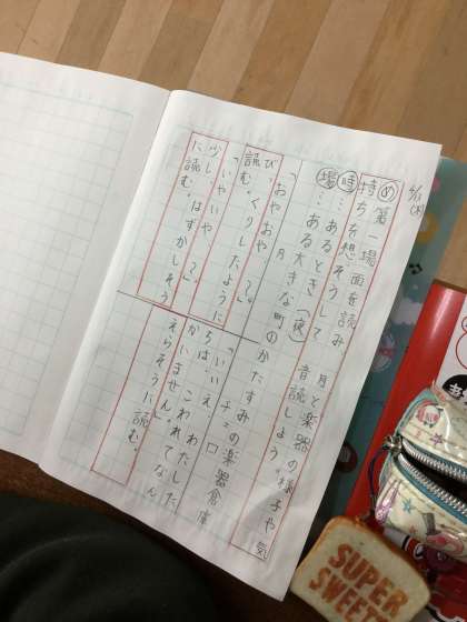 この学習の目標は、場面の移り変わりに注意しながら人物の様子や気持ちを思い浮かべて音読することです。その目標を達成するために、授業では、登場人物になりきって、工夫して音読をする練習をしています。
