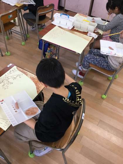 まず、太いみきとたくさんの枝をコンテで描き、その後、絵の具で色をぬりました。