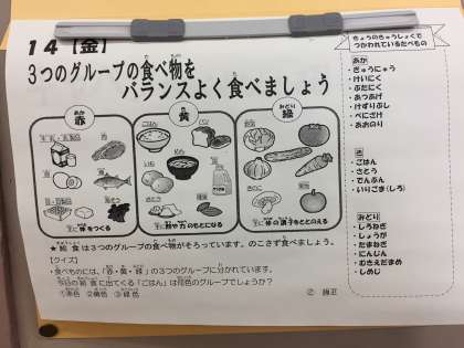 毎日給食には、赤・黄・緑の食べものがバランスよく入っています。