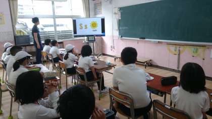 これまで、C−NETの先生と英語の学習に取り組んできているので、あたふたしているのは教える担任で、子どもたちはとても落ち着いて取り組んでいました。