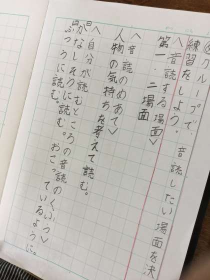 グループで、どの場面の音読をするのかを決めたあと、グループでの音読のめあてを決めます。そして、グループでのめあてを共有したあと、それぞれ個人で読む場所を決め、めあてを決めます。