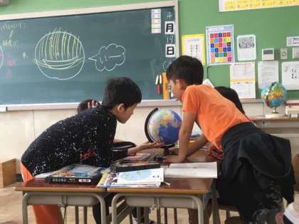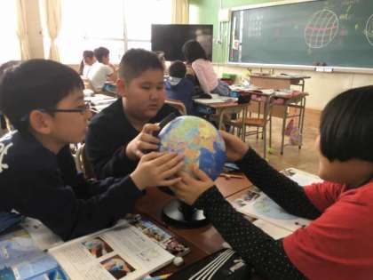 > 子どもたちは夢中になって地球儀を見つめていました。