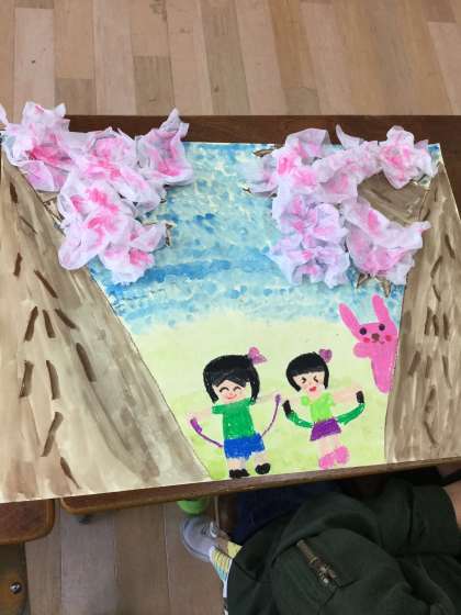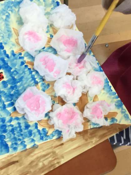 おはな紙を使って、さくらの形をつくり、色をつけていきました。