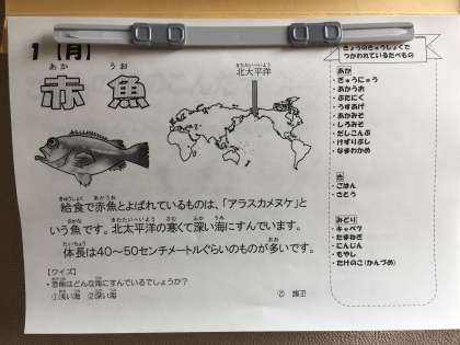 給食で使用しているアカウオは「アラスカメヌケ」です。「アラスカメヌケ」は宮城県以北、ベーリング海、カリフォルニア南部に至る北太平洋の通常水深160〜300mに生息し、卵胎生で10月から2月に交尾、3月〜6月に仔魚を出産します。体長は40〜50cmです。