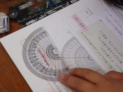 今日は分度器をじっくり見て、めもりの読み方や、直角が90度であること、2直角が180度であること、4直角が360度であることを学びました。