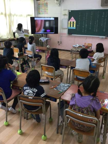 そして、意見交流を終えたあと、映像教材を使って、ヤドカリとイソギンチャクの生態について、勉強しました。