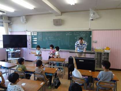 金曜日にラージ先生と外国語の学習をしました。初めて聞く言葉が多くて、難しそうな顔をする一年生。でも時間がたつと、言葉の意味やゲームの内容が分かってきてすごく楽しそうに活動していました。