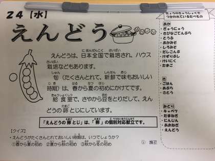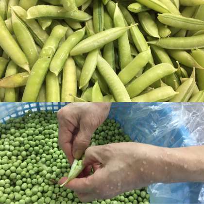 今日の給食の「えんどう」は、給食調理員さんが1つずつていねいにさやから豆をとりだして、「えんどうの卵とじ」に仕上げたものです。