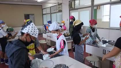 班の友だちと協力しながら、こんろや穴じゃくしを上手に使って調理していました。