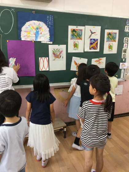 今日の図画工作科の授業では、ひとつひとつ紙を切って、鳳凰のような鳥の羽をつける作業を行いました。
