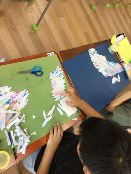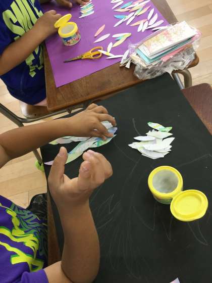 最初のほうは、きれいな羽の流れを出したり、間があかないようにひとつひとつ羽をはったりする作業を上手にできない子どもがいましたが、時間が経つにつれて、上手にできていました。