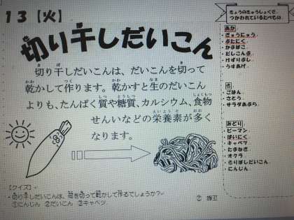 切り干しだいこんは、乾燥させることによって、生のだいこんよりもたんぱく質や糖質、カルシウムなどが増加します。