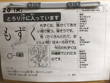 大阪市の学校給食では沖縄県でとれたもずくを使っています。
