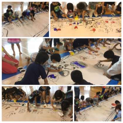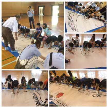 2時間目は「こよりで描こう!」ということで、いつも使っている筆ではなく、こよりで自分の好きなものを描きました。筆の加減とはまた違って難しかったようですが、みんなとっても楽しそうに思い思いの絵を描いていました。