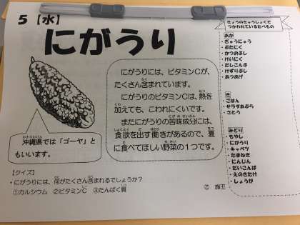 今日の給食の「にがうり」は、「ゴーヤ」「ツルレイシ」とも呼ばれています。日本では沖縄や九州南部などで栽培されています。