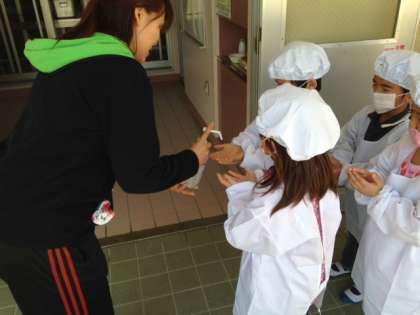 給食エプロンとマスクを身につけ、給食室に出発進行!!