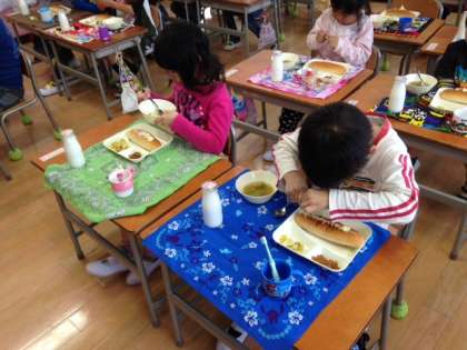 教室では、牛乳を配ったり、盛り付けされたお皿を配ったり、まるでレストランのホールスタッフのように活動します。
