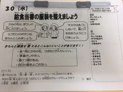 給食当番についてです。安全で衛生的に給食を準備するためには、手洗いと服装を整えることが大切です。給食着を着ける前にトイレを済ませ、手洗いをしましょう。。