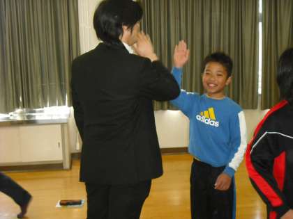 あいさつが終わるとハイタッチして、次の友だちにあいさつをしに行きます。