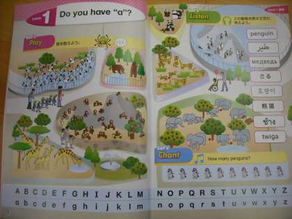 そのあとは、動物園の絵を見て何の動物が、何匹いるのか英語で答えていました。