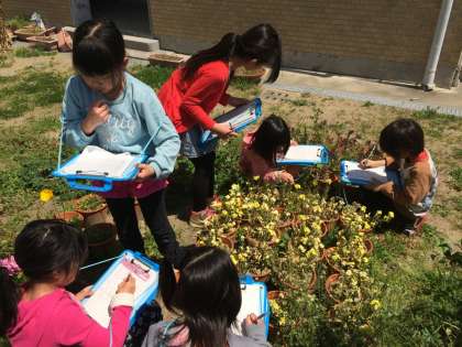 今は「身近なしぜんのかんさつ」をしています。探検ボードを抱えて、運動場に咲く花を観察し、気づいたことやスケッチを一生懸命にしていました。