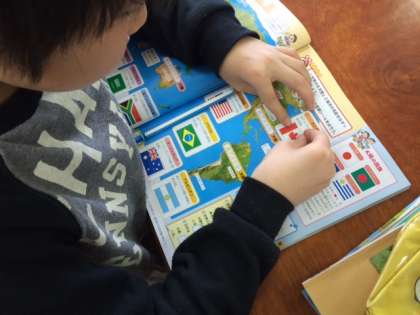 資料集を使って、なぞったり、シールを張ったりして、それぞれの国の名前や位置を覚えていきました。