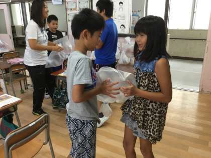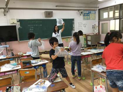 閉じ込めた空気を使って、友だちと押し合いっこをしました。