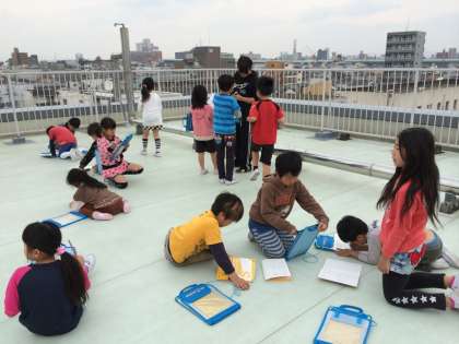 社会「わたしたちの町」の学習で屋上から生江の町を見ました。初めて行く屋上に少々興奮気味の子どもたち。行く前には安全に気を付けることを確認して、いざ屋上へ!