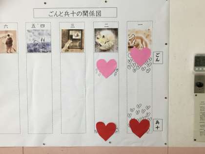 中心人物「ごん」と「兵十」がどのような気持ちでいて、どのように変化していくかを考えています。