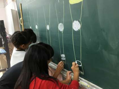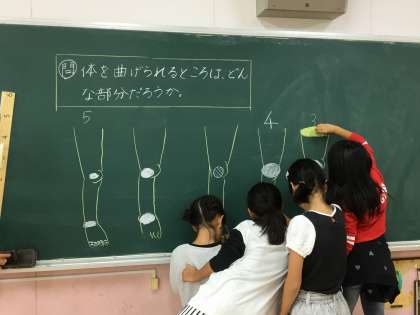 今日は足の関節について調べ、黒板に曲がるところ書き込みました。そして、実際に動かして、足は関節で曲がり、動くことが分かりました。