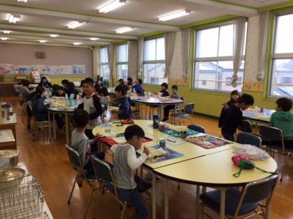 今日は四年生と一緒に交流給食でした。給食を食べるだけではなく、しりとりやクイズを一緒に楽しみながら食事をすることができました。