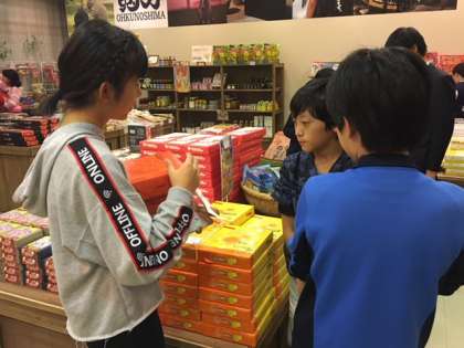 宿舎内のお土産コーナーでお土産を選んでいます。限られた金額の中で真剣に選んでいます。