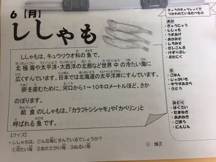 給食に出てくるししゃもはカラフトシシャモ(カペリン)と呼ばれる魚です。北太平洋北部から北極海、北大西洋北部にかけて世界的に広く分布しています。日本では大変少ないですが、春から秋にかけてオホーツク海沿岸にも来遊します。