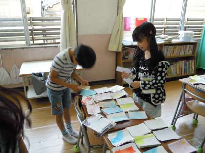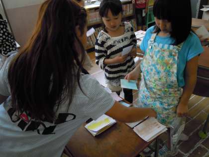 図画工作の学習で「材料や方法を考えて紙に模様をつけ、友達と交換してから絵に表わす」という学習をしています。今日はペーパーショップを開きました。子どもたちが自分で模様を考えて作った紙を交換している様子です。この後、模様を作った紙で竜を作成する予定です。またホームページで続きを紹介します。どうぞお楽しみに!