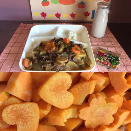 今日の給食のビーフカレーライスには、給食調理員さんが「ラッキーにんじん」を作って入れてくださいました。子どもたちは、自分のおさらに入っているか「ドキドキ」していました。