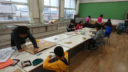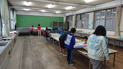 段ボールを切ったり、割り箸を輪ゴムで止めたり黙々と製作に励んでいます。