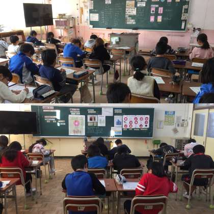 今日は、2時間目に3年生で「おやつについて考えよう」、6時間目に6年生で「バランスのとれた食事を考えよう」について栄養指導しました。