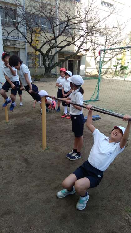 体育で「鉄棒運動」をしています。前まわりは簡単にできても、逆上がりはなかなか難しいようで、何度もチャレンジしてがんばっています!!