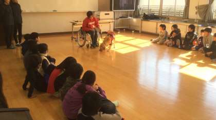 国語の学習で「もうどう犬の訓練」の学習をしてきたので、「はたらく犬」のことについては知っていたり、介助犬のことを調べていて知っていたりする子もいましたが、実際に自分の目で見て、実勢に訓練されている方の話を聞くことで新たな発見がたくさんあったようです。