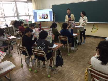 国語の学習で生江の豊かな未来についてみんなで考え、どんな町にしていくか、何ができるのか具体的な提案を話し合っています。そのヒントに、ということで、千林商店街でタバコ屋さんを営む吉田さん、また千林在住のとしださんがお話をしにやってきてくれました。